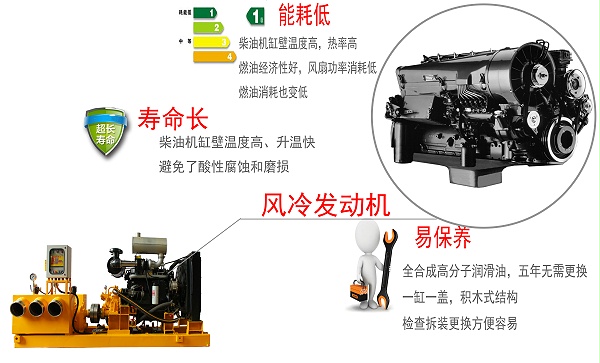采用能耗低,寿命长,易保养的风冷柴油发动机,故障率比水冷柴油机降低约27%,风冷柴油机在零下35℃情况下,仍能很好起动和可靠的工作,不会有冻裂机体的危险,也不需用防冻液。被用于军用汽车和特殊用途车配置。